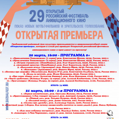 С 20 по 24 марта 2024 года культурно-досуговые учреждения Воронежской области присоединятся к широкомасштабной акции «Открытая премьера», которую в 12-ый раз проводит Открытый российский фестиваль анимационного кино.