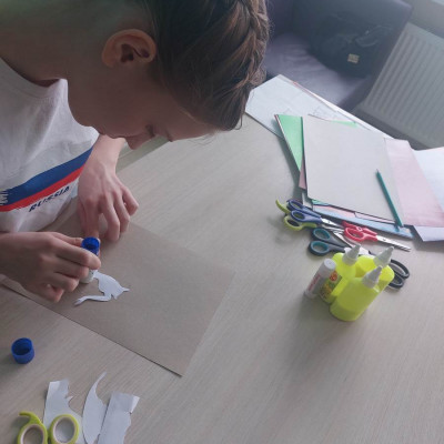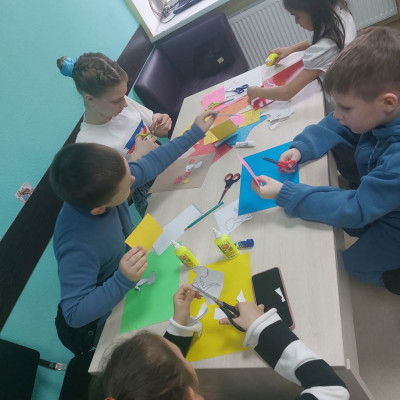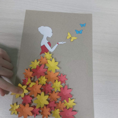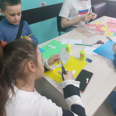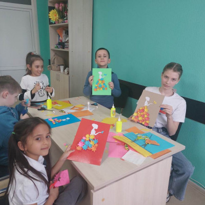 Участники кружка «Умей-ка» изготовили яркую весеннюю композицию, использую заранее подготовленные трафареты цветов, бабочек и других элементов.