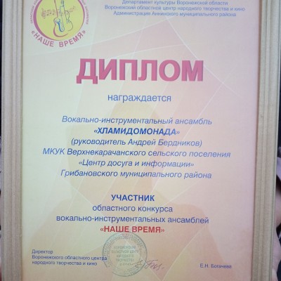 3 сентября состоялся областной конкурс вокально-инструментальных ансамблей «НАШЕ ВРЕМЯ». От Грибановского района в нем принял участие вокально-инструментальный ансамбль «Хламидомонада», рук. А. Бердников (МКУК Верхнекарачанского сельского поселения «Центр досуга и информации»). Ансамбль исполнил две авторские песни: «Ты держала меня не за того», «Мои груши расцветали, мои яблони цвели», музыку и слова написал Андрей Бердников.