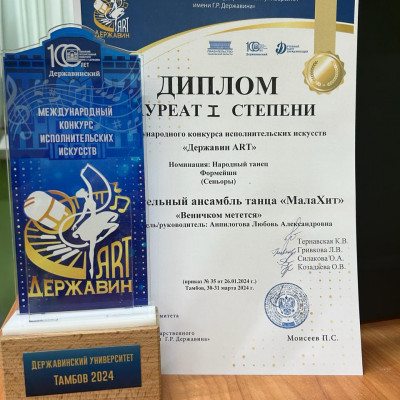 31 марта ансамбль народного танца " Малахит" Грибановского РДК стал лауреатом 1 степени в международном конкурсе исполнительских искусств " ДЕРЖАВИН ART" в г. Тамбове