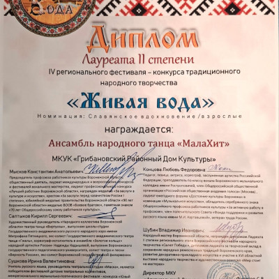 Ансамбль народного танца "Малахит", Грибановского районного Дома культуры, стал лауреатом 2 степени IV конкурса народного творчества "Живая вода", который проходил 10 октября в селе Архангельское Аннинского района
