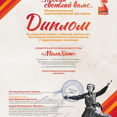 Самодеятельный ансамбль народного танца «МалаХит» Грибановского районного Дома культуры (руководитель Любовь Анпилогова), с хореографической композицией «Смуглянка», стал участником межрегионального хореографического фестиваля «Победы светлый вальс», посвященного 80-й годовщине Победы в Великой Отечественной войне 1941-1945 годов, Году Защитника Отечества в России и Году Команды Победы в Ленинградской области.