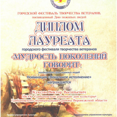 Солист Грибановского районного Дома культуры Виктор Васильевич Куксин стал лауреатом городского фестиваля творчества «Мудрость поколений говорит» и принял участие в Гала-концерте, который состоялся 29 сентября в г. Воронеж. Он проникновенно исполнил свою авторскую песню «Осенний романс», чем покорил и компетентное жюри и зрителей. От души поздравляем с заслуженной победой!