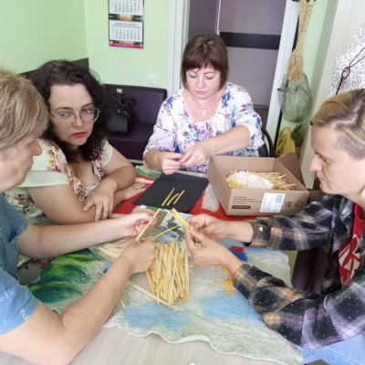 Присутствующие познакомились с секретами работы из соломки, из шерсти, раскрыли возможности изготовления букетов из пшеницы. Всех заинтересовал тот факт, что из соломки можно создавать предметы для украшения внутреннего и внешнего интерьера. В ходе мозгового штурма было выдвинуто много идей для изготовления поделок из различных природных материалов. Вооружившись ножницами, соломкой и клеем, участники с удовольствием попробовали самостоятельно выкладывать интересные узоры.