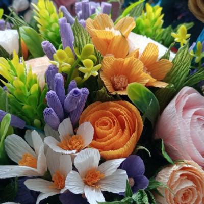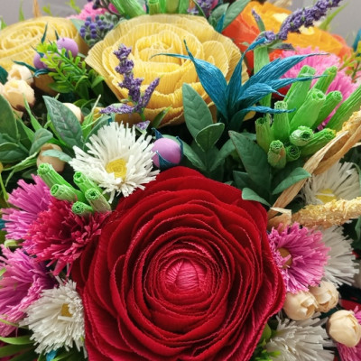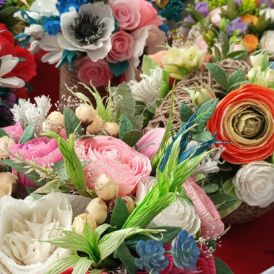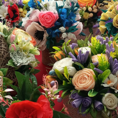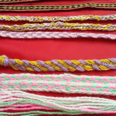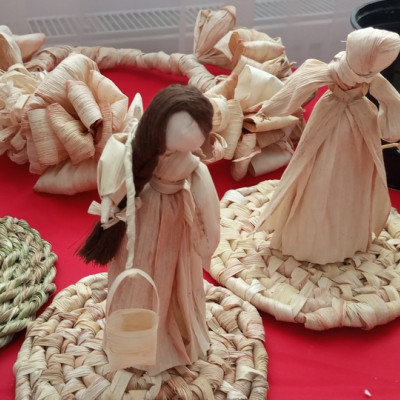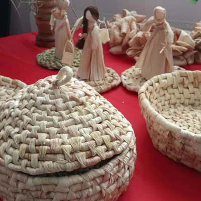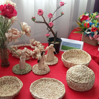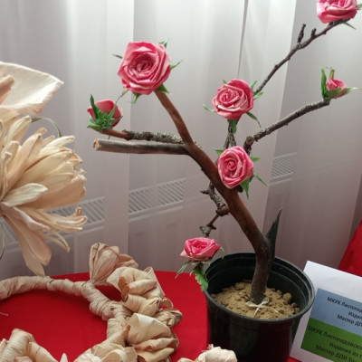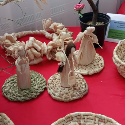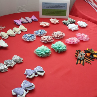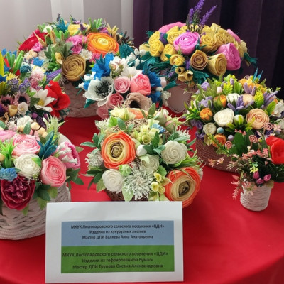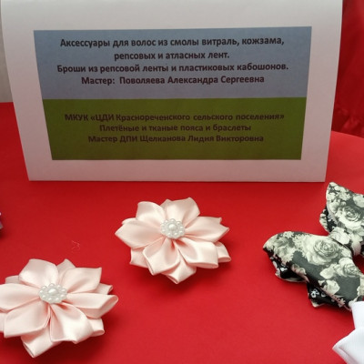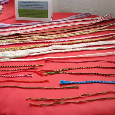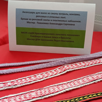 Мастера предоставили для экспозиции работы, выполненные из кукурузных листьев, гофрированной бумаги, репсовых и атласных лент, а также плетёные пояса и браслеты.