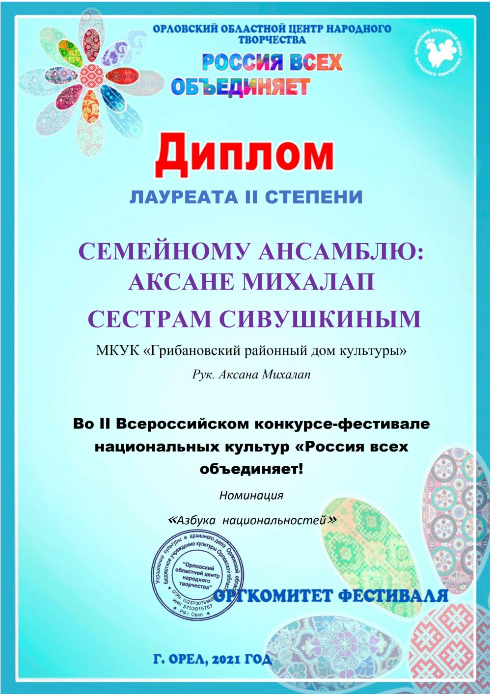 Так называется всероссийский фестиваль национальных культур, организованный Орловским центром народного творчества, лауреатом II степени II которого стал семейный ансамбль из Грибановского района.