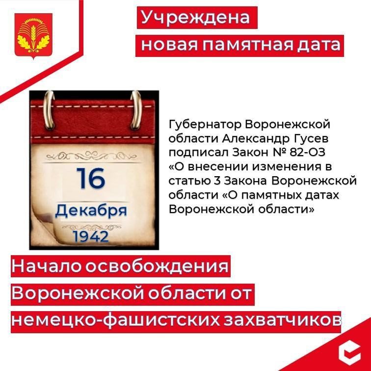 21 сентября 2022 года губернатор Воронежской области Александр Гусев подписал Закон № 82-ОЗ «О внесении изменения в статью 3 Закона Воронежской области «О памятных датах Воронежской области».
